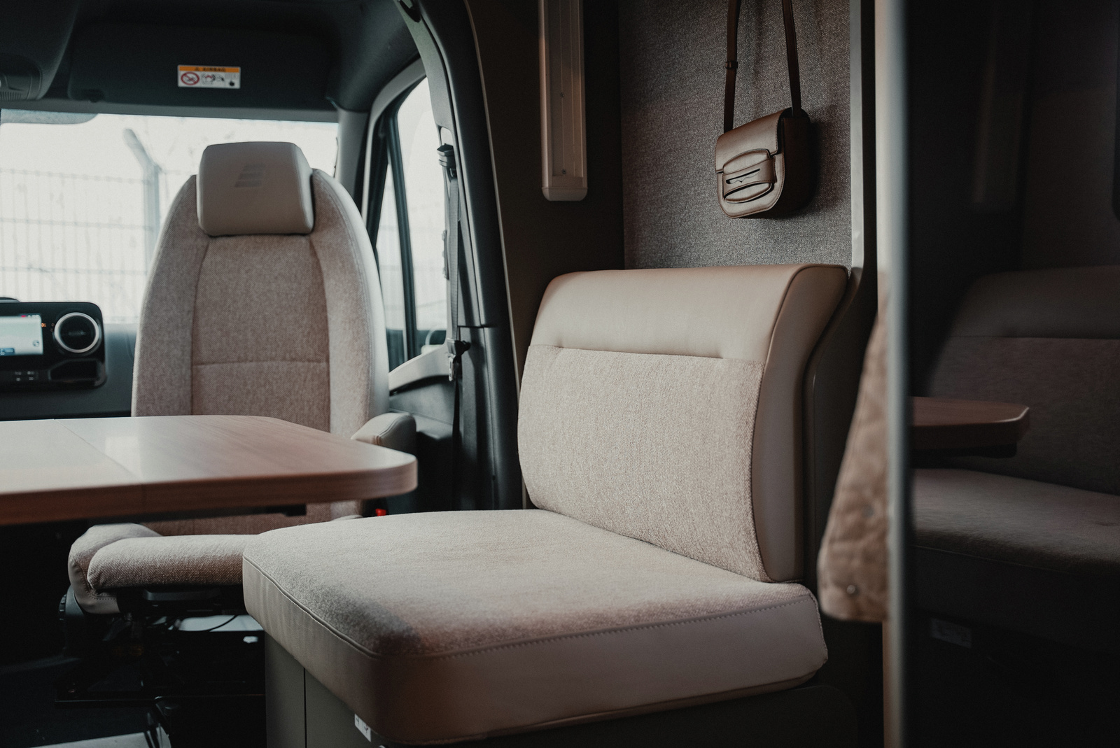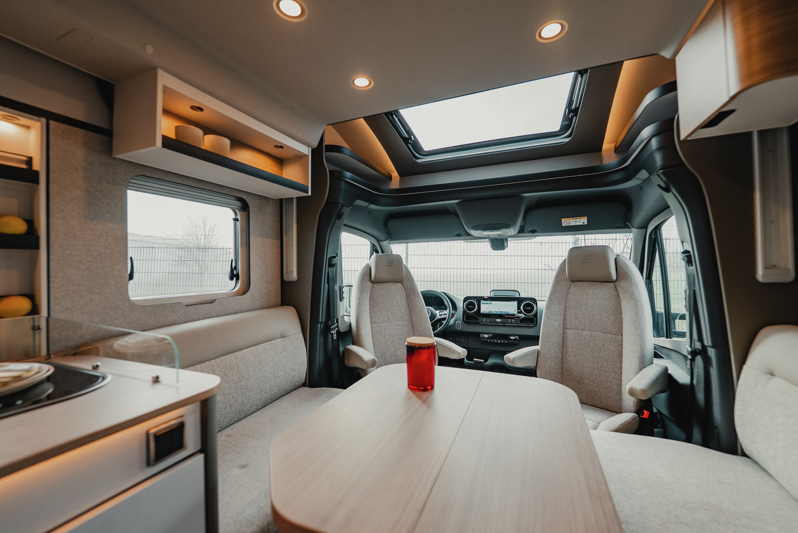 Tilava Face-to-Face istuinryhmä ja mahdollisuus tilata myös alaslaskettava nostovuode! Tämä konfiguraatio ilman vuodetta.