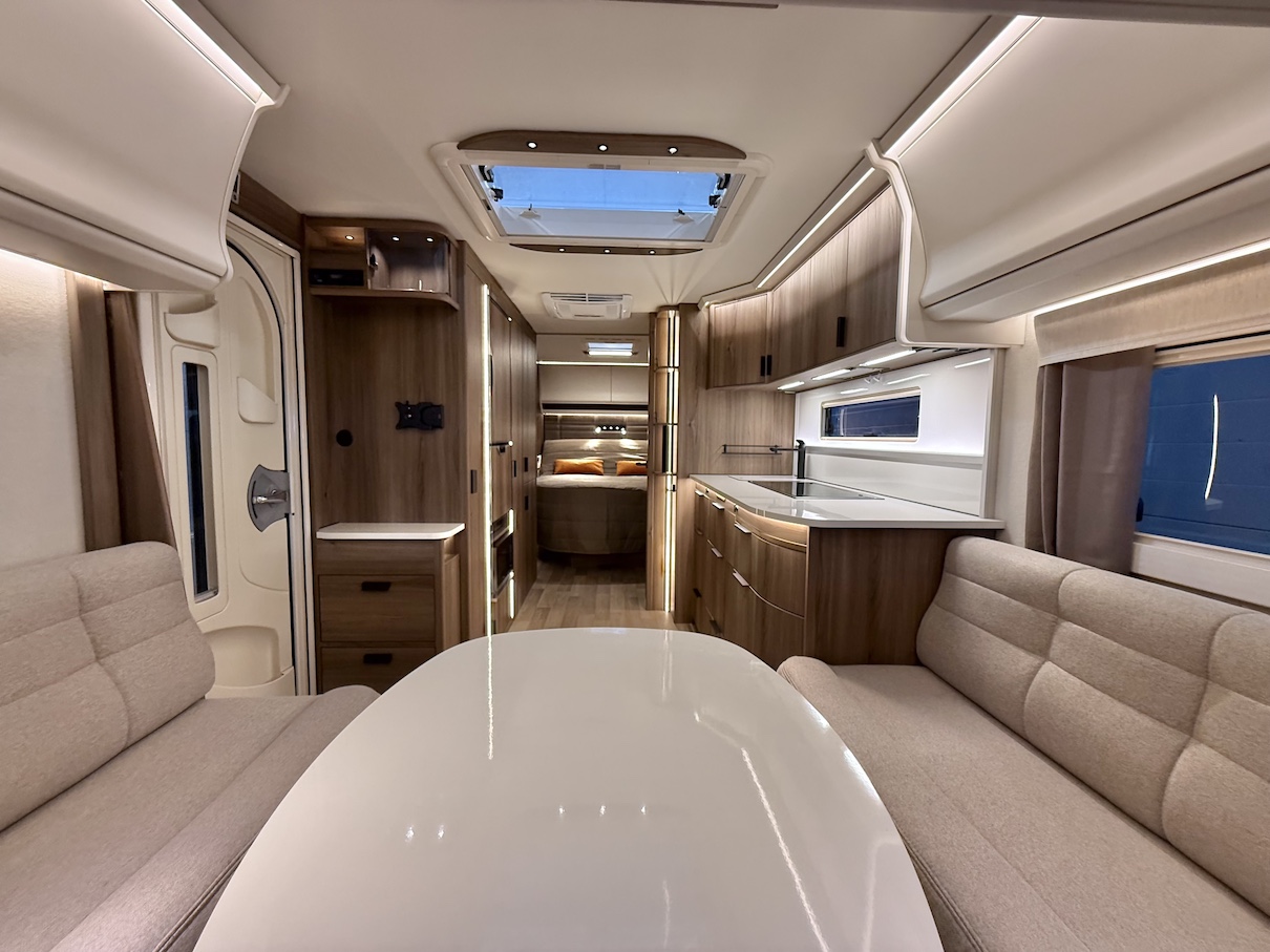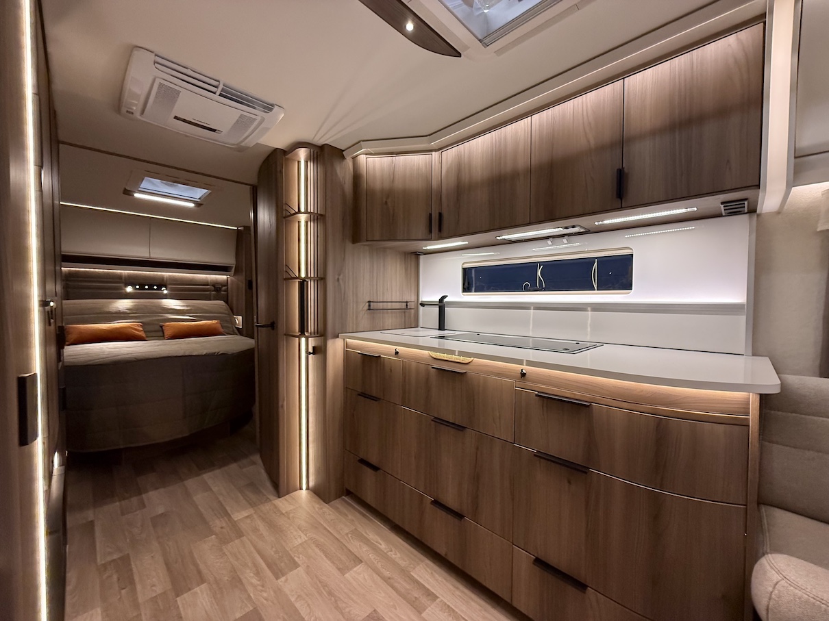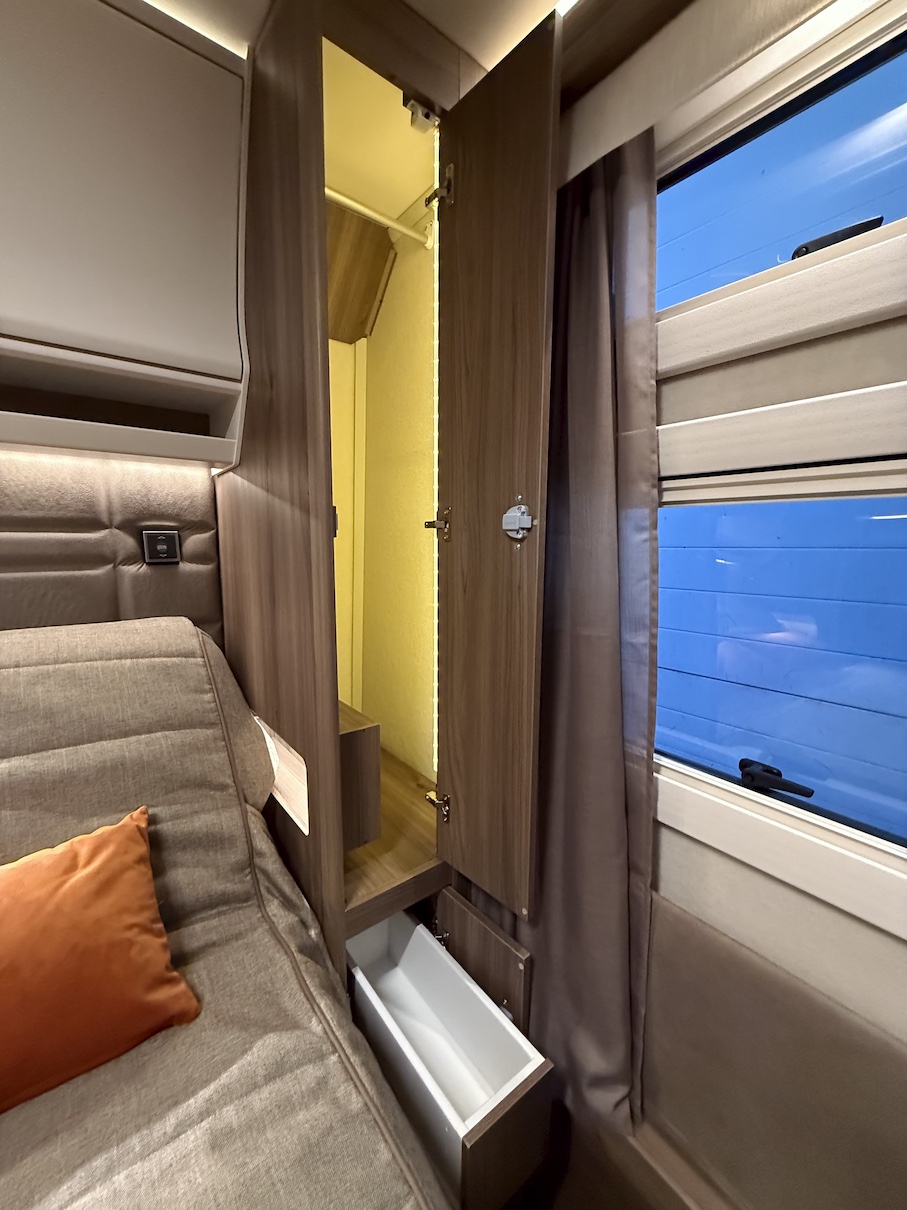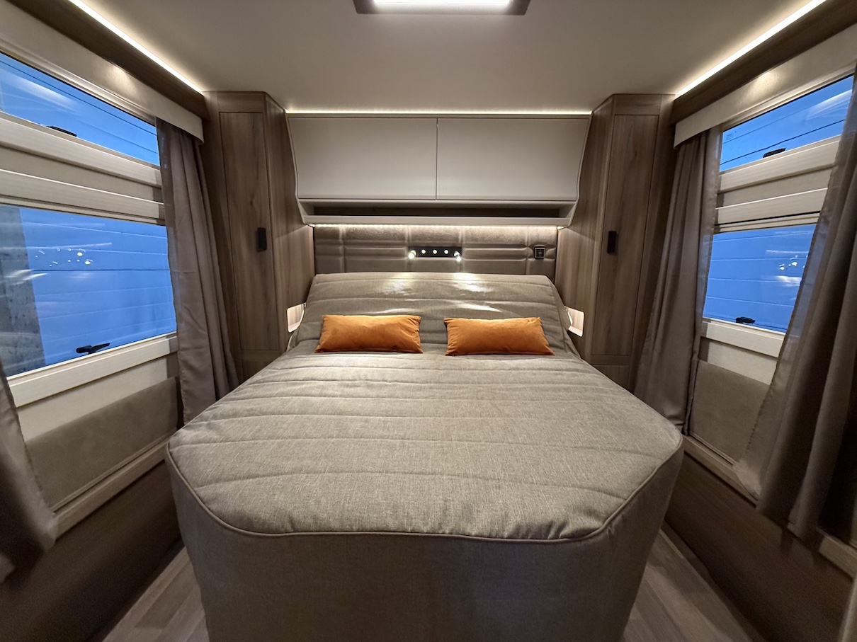 Onyx -kokoluokka tarjoaa paljon kaappitilaa ja lepoasentoon kääntyvä saarekevuode mahdollistaa sujuvan kulkemisen makuuhuoneeseen päiväsaikana.